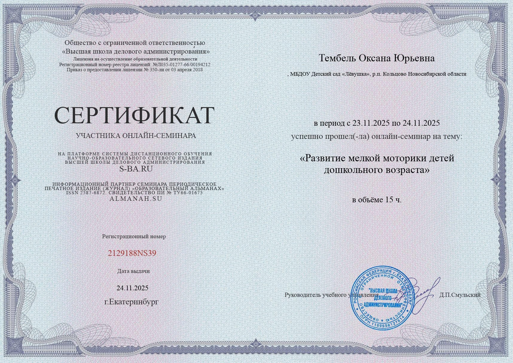 Сертификат участника онлайн-семинара "Развитие мелкой моторики детей дошкольного возраста" (15ч.) (24.11.2025г.)